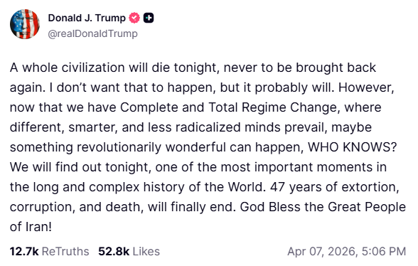 ڈونلڈ ٹرمپ نے ایران کے حوالے سے ایک سخت اور غیر معمولی بیان جاری کرتے ہوئے کہا ہے کہ “آج رات ایک پوری تہذیب ختم ہو سکتی ہے”، جس نے عالمی سطح پر تشویش کو بڑھا دیا ہے۔ یہ بیان انہوں نے اپنے سوشل میڈیا پلیٹ فارم پر جاری کیا، جہاں انہوں نے ایران کو ایک معاہدے کی ڈیڈ لائن دی تھی۔