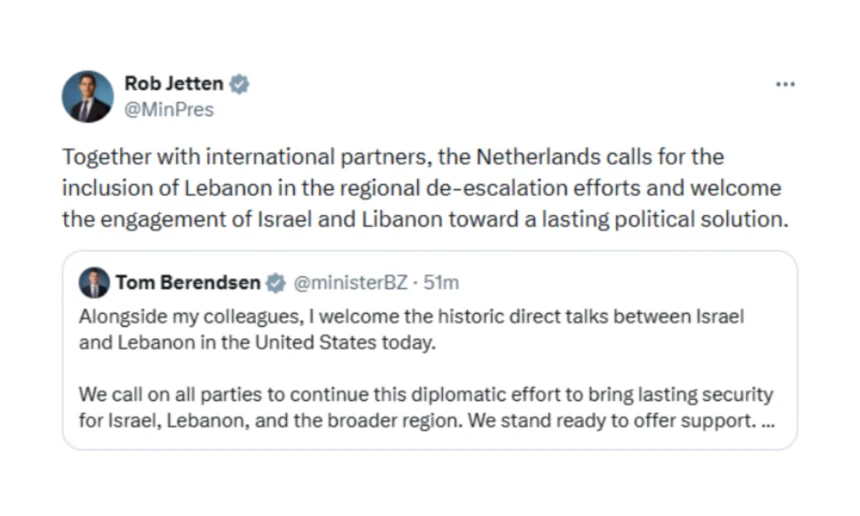 نیدرلینڈز کے وزیراعظم روب جیٹن نے اسرائیل اور لبنان کے درمیان حالیہ براہِ راست مذاکرات کا خیرمقدم کرتے ہوئے لبنان کو جاری جنگ بندی میں شامل کرنے کا مطالبہ کیا ہے۔